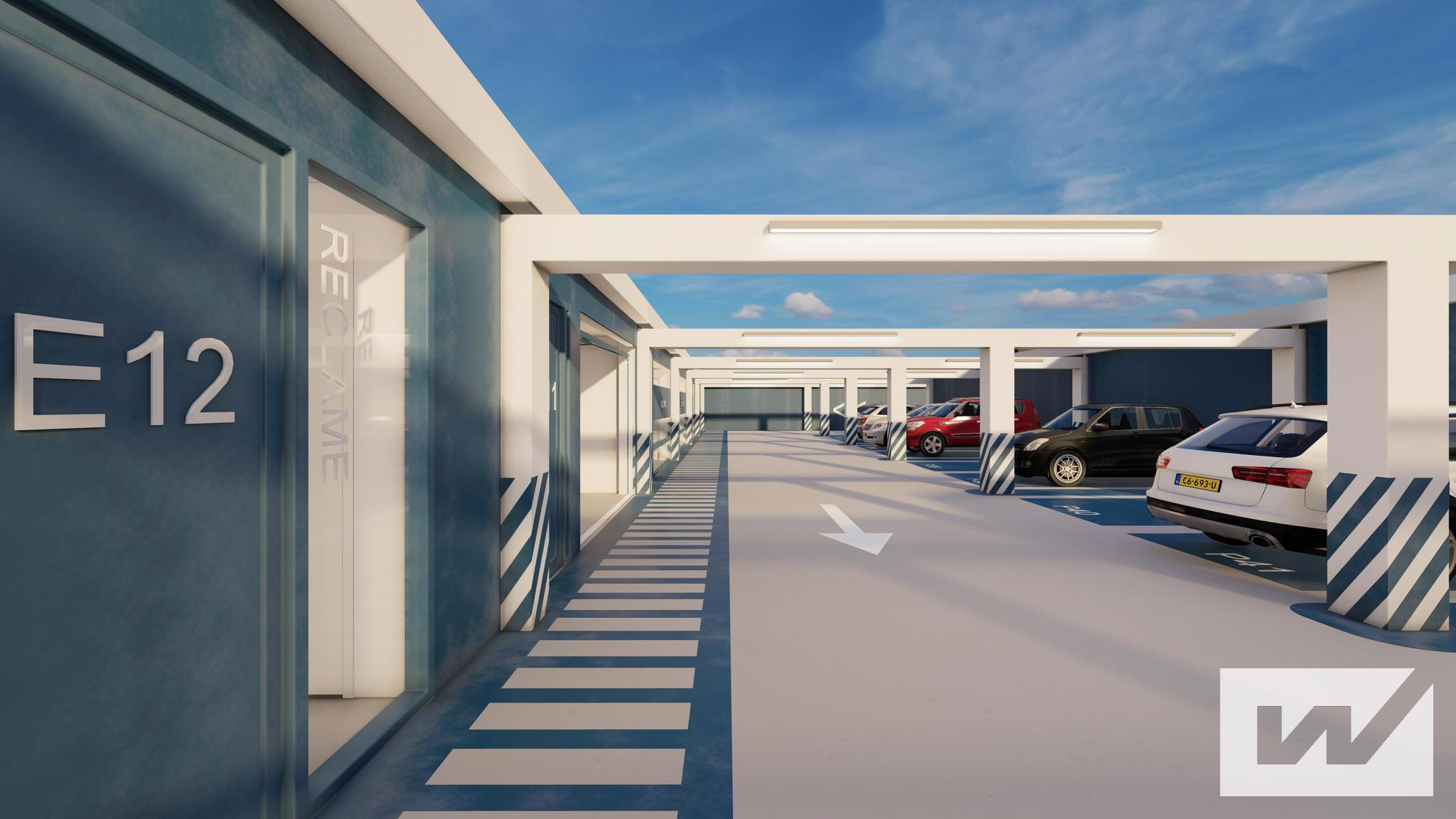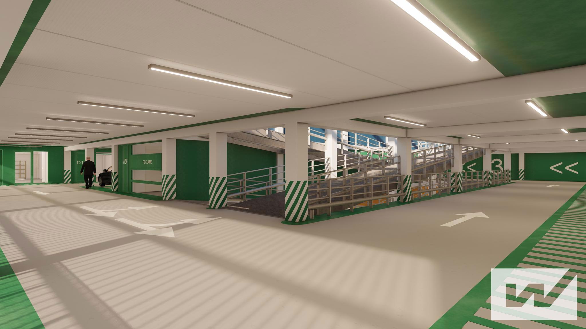 Alle verdiepingen zijn bereikbaar met auto of busje via een overdekte hellingbaan (3,1 meter breed)